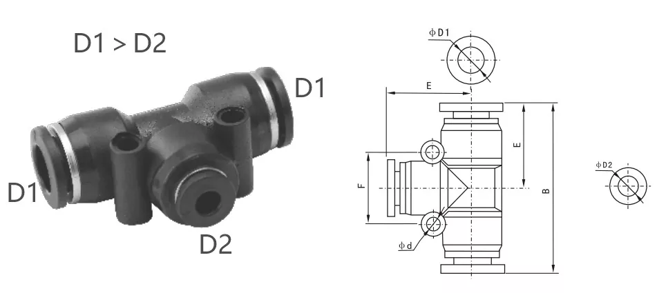 পিই ফিটিং (সমান টি ইউনিয়ন): তিনটি টিউব একই আকারের তিনটি বায়ুসংক্রান্ত টিউব সংযোগ করার জন্য উপযুক্ত একই বাইরের ব্যাস রয়েছে।