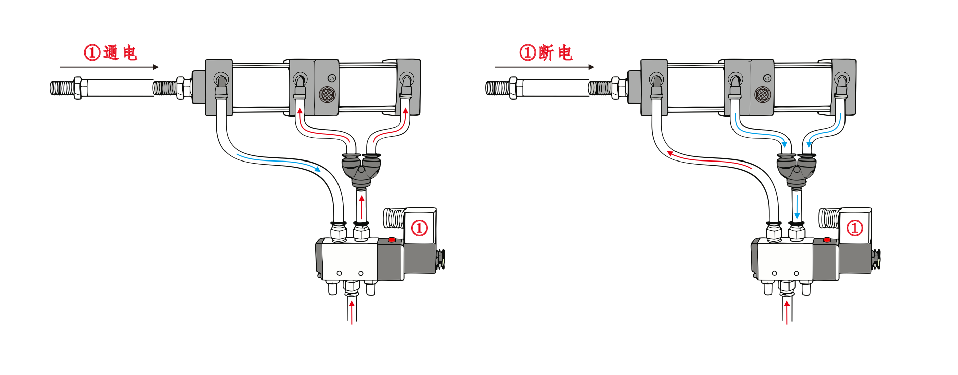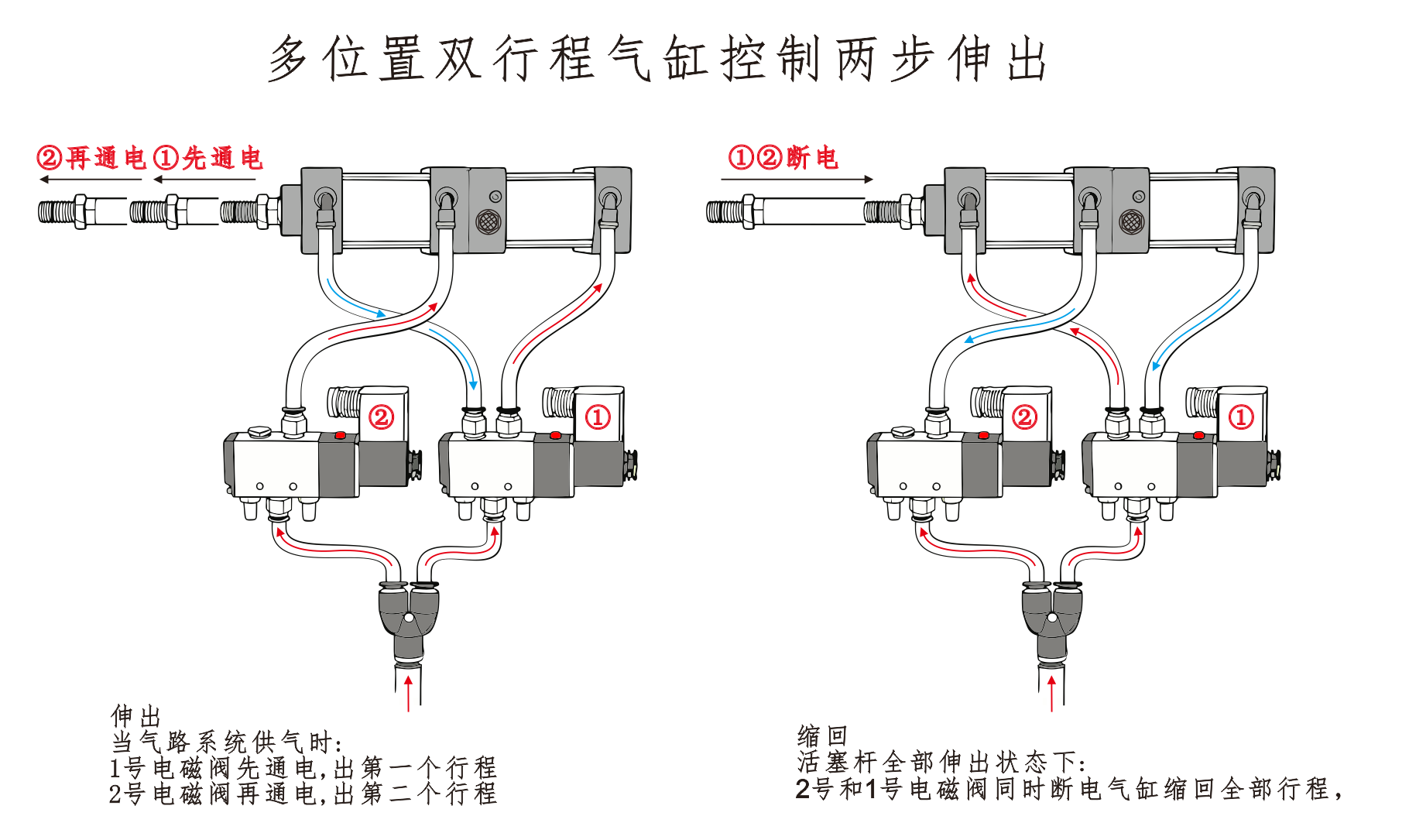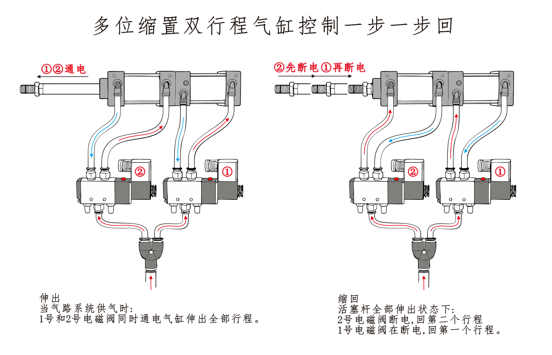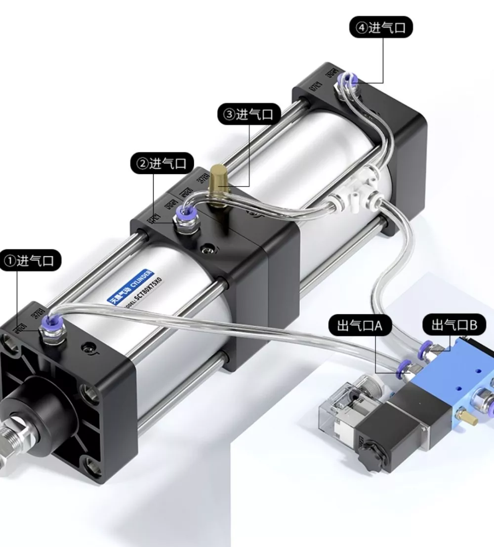 সিলিন্ডার① এর এয়ার ইনলেট সোলেনয়েড ভালভের পোর্ট A এর সাথে সংযুক্ত এবং সিলিন্ডার④ এর এয়ার ইনলেট সোলেনয়েড ভালভের পোর্ট B এর সাথে সিরিজে সংযুক্ত থাকে। সিলিন্ডার③ এর এয়ার ইনলেট একটি সাইলেন্সারের সাথে সংযুক্ত। যখন সোলেনয়েড ভালভের পোর্ট A শক্তিযুক্ত হয়, তখন সিলিন্ডারগুলি প্রত্যাহার করা অবস্থানে থাকে। যখন পোর্ট বি সক্রিয় হয়, তখন সিলিন্ডারগুলি কাজ করতে শুরু করে।