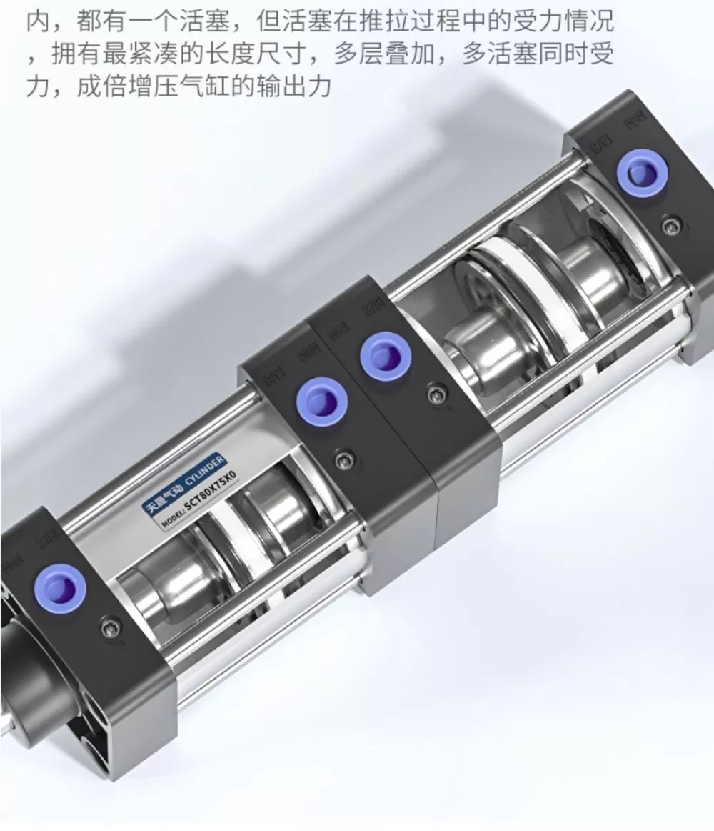 SCT টাই-রড সিলিন্ডারে রয়েছে দ্বি-মুখী YCC সিলিং রিং এবং একটি শক্তিশালী ডাবল-স্ট্রোক ডিজাইন, একটি কম্প্যাক্ট এবং পরিমার্জিত চেহারা যা দ্রুত ক্রিয়া এবং মসৃণ, স্থিতিশীল আউটপুট নিশ্চিত করে। সিলিন্ডারের প্রতিটি স্তরে একটি পৃথক পিস্টন থাকে এবং পুশ-পুল প্রক্রিয়া চলাকালীন একাধিক পিস্টন লোড ভাগ করে নেয়, যার ফলে সিলিন্ডারটি তার মাল্টি-লেয়ার স্তুপীকৃত কাঠামোর মাধ্যমে গুণিত আউটপুট বল তৈরি করার সময় সবচেয়ে কমপ্যাক্ট দৈর্ঘ্য অর্জন করতে পারে। এই ডাবল-ফোর্স ডিজাইনটি শক্তিশালী শক্তি সরবরাহ করে, এবং ছয়-সিল-রিং কনফিগারেশনটি চমৎকার সিলিং কার্যক্ষমতা প্রদান করে, সিলিন্ডারকে লিকেজ ছাড়াই 1.4 MPa পর্যন্ত চাপ ধরে রাখতে সক্ষম করে।